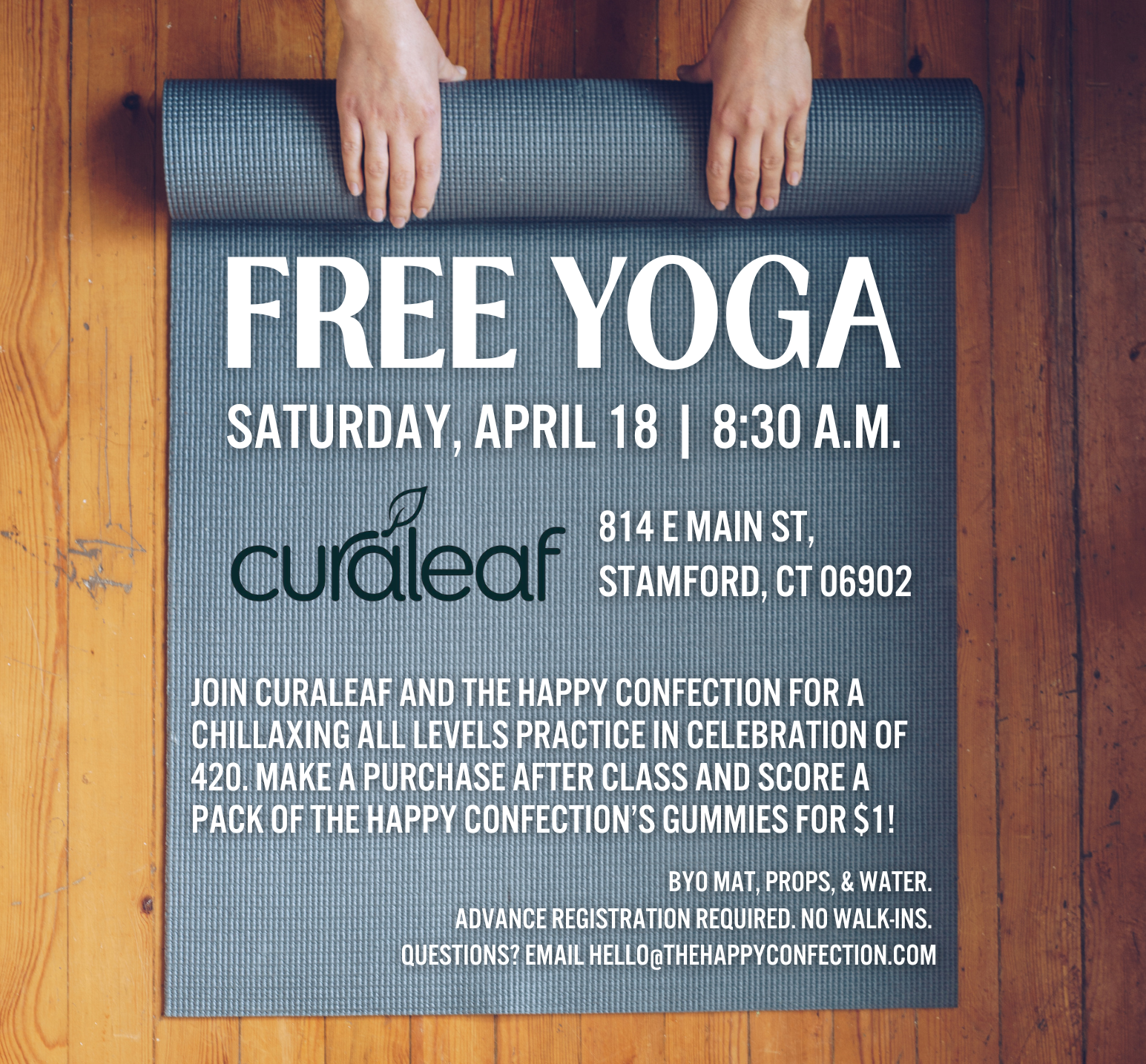 Join us for a relaxing, all levels flow led by Lindsay Roth from The Happy Confection and then shop Curaleaf’s extensive offerings when class is complete. All attendees can receive a pack of The Happy Confection’s award winning gummies for $1 with any purchase.